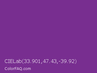 CIELab 33.901,47.43,-39.92 Color is a normal purple color and the nearest color is Vivid Violet #803790. Hex code #782e90 and RGB value is rgb(120,46,144). In RGB color space, this color is composed of 47% red, 18% green, 56% blue, In CMYK color space, this color is composed of 17% cyan, 68% magenta, 0% yellow , 44% black , In HSL color space, this color has a hue angle of 285° , 52% saturation and 37% lightness.