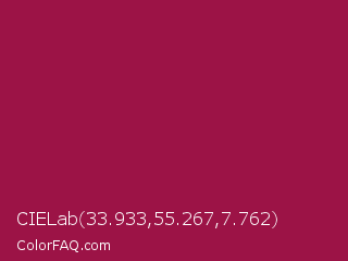CIELab 33.933,55.267,7.762 Color is a normal rose color and the nearest color is Big Dip O Ruby #9c2542. Hex code #9c1346 and RGB value is rgb(156,19,70). In RGB color space, this color is composed of 61% red, 7% green, 27% blue, In CMYK color space, this color is composed of 0% cyan, 88% magenta, 55% yellow , 39% black , In HSL color space, this color has a hue angle of 338° , 78% saturation and 34% lightness.