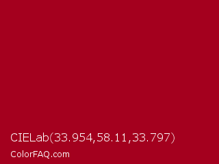 CIELab 33.954,58.11,33.797 Color is a normal red color and the nearest color is Carmine #960018. Hex code #a4001e and RGB value is rgb(164,0,30). In RGB color space, this color is composed of 64% red, 0% green, 12% blue, In CMYK color space, this color is composed of 0% cyan, 100% magenta, 82% yellow , 36% black , In HSL color space, this color has a hue angle of 349° , 100% saturation and 32% lightness.