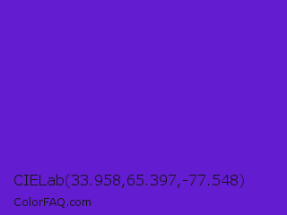 CIELab 33.958,65.397,-77.548 Color is a normal violet color and the nearest color is Purple Heart Crayola #652dc1. Hex code #631ccf and RGB value is rgb(99,28,207). In RGB color space, this color is composed of 39% red, 11% green, 81% blue, In CMYK color space, this color is composed of 52% cyan, 86% magenta, 0% yellow , 19% black , In HSL color space, this color has a hue angle of 264° , 76% saturation and 46% lightness.