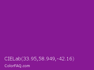 CIELab 33.95,58.949,-42.16 Color is a normal magenta color and the nearest color is Violet Eggplant #991199. Hex code #871994 and RGB value is rgb(135,25,148). In RGB color space, this color is composed of 53% red, 10% green, 58% blue, In CMYK color space, this color is composed of 9% cyan, 83% magenta, 0% yellow , 42% black , In HSL color space, this color has a hue angle of 294° , 71% saturation and 34% lightness.