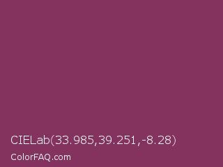 CIELab 33.985,39.251,-8.28 Color is a normal rose color and the nearest color is Boysenberry #873260. Hex code #83335e and RGB value is rgb(131,51,94). In RGB color space, this color is composed of 51% red, 20% green, 37% blue, In CMYK color space, this color is composed of 0% cyan, 61% magenta, 28% yellow , 49% black , In HSL color space, this color has a hue angle of 328° , 44% saturation and 36% lightness.