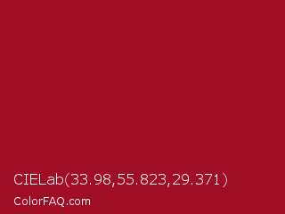 CIELab 33.98,55.823,29.371 Color is a normal red color and the nearest color is Ruby Red #9b111e. Hex code #a10d25 and RGB value is rgb(161,13,37). In RGB color space, this color is composed of 63% red, 5% green, 15% blue, In CMYK color space, this color is composed of 0% cyan, 92% magenta, 77% yellow , 37% black , In HSL color space, this color has a hue angle of 350° , 85% saturation and 34% lightness.