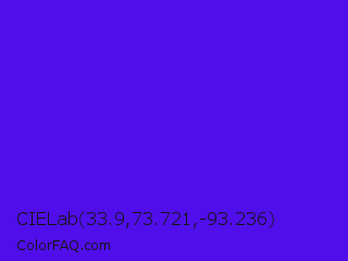 CIELab 33.9,73.721,-93.236 Color is a normal indigo color and the nearest color is Han Purple #5218fa. Hex code #500eea and RGB value is rgb(80,14,234). In RGB color space, this color is composed of 31% red, 5% green, 92% blue, In CMYK color space, this color is composed of 66% cyan, 94% magenta, 0% yellow , 8% black , In HSL color space, this color has a hue angle of 258° , 89% saturation and 49% lightness.