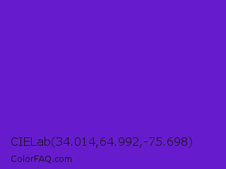 CIELab 34.014,64.992,-75.698 Color is a normal violet color and the nearest color is Purple Heart Crayola #652dc1. Hex code #661ccc and RGB value is rgb(102,28,204). In RGB color space, this color is composed of 40% red, 11% green, 80% blue, In CMYK color space, this color is composed of 50% cyan, 86% magenta, 0% yellow , 20% black , In HSL color space, this color has a hue angle of 265° , 76% saturation and 45% lightness.