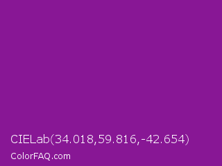 CIELab 34.018,59.816,-42.654 Color is a normal magenta color and the nearest color is Violet Eggplant #991199. Hex code #881795 and RGB value is rgb(136,23,149). In RGB color space, this color is composed of 53% red, 9% green, 58% blue, In CMYK color space, this color is composed of 9% cyan, 85% magenta, 0% yellow , 42% black , In HSL color space, this color has a hue angle of 294° , 73% saturation and 34% lightness.