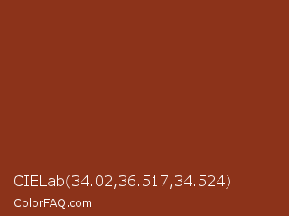 CIELab 34.02,36.517,34.524 Color is a normal red color and the nearest color is Kobe #882d17. Hex code #8c331a and RGB value is rgb(140,51,26). In RGB color space, this color is composed of 55% red, 20% green, 10% blue, In CMYK color space, this color is composed of 0% cyan, 64% magenta, 81% yellow , 45% black , In HSL color space, this color has a hue angle of 13° , 69% saturation and 33% lightness.