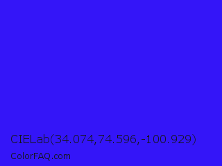 CIELab 34.074,74.596,-100.929 Color is a normal indigo color and the nearest color is Electric Ultramarine #3f00ff. Hex code #3415f8 and RGB value is rgb(52,21,248). In RGB color space, this color is composed of 20% red, 8% green, 97% blue, In CMYK color space, this color is composed of 79% cyan, 92% magenta, 0% yellow , 3% black , In HSL color space, this color has a hue angle of 248° , 94% saturation and 53% lightness.