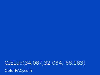 CIELab 34.087,32.084,-68.183 Color is a normal blue color and the nearest color is Absolute Zero #0048ba. Hex code #0545bf and RGB value is rgb(5,69,191). In RGB color space, this color is composed of 2% red, 27% green, 75% blue, In CMYK color space, this color is composed of 97% cyan, 64% magenta, 0% yellow , 25% black , In HSL color space, this color has a hue angle of 219° , 95% saturation and 38% lightness.