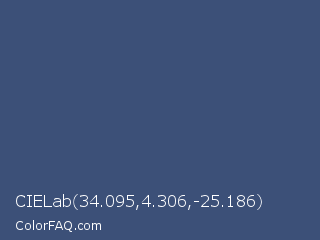 CIELab 34.095,4.306,-25.186 Color is a normal blue color and the nearest color is East Bay #414c7d. Hex code #3c5078 and RGB value is rgb(60,80,120). In RGB color space, this color is composed of 24% red, 31% green, 47% blue, In CMYK color space, this color is composed of 50% cyan, 33% magenta, 0% yellow , 53% black , In HSL color space, this color has a hue angle of 220° , 33% saturation and 35% lightness.