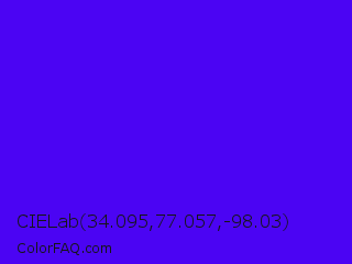 CIELab 34.095,77.057,-98.03 Color is a normal indigo color and the nearest color is Electric Ultramarine #3f00ff. Hex code #4b04f3 and RGB value is rgb(75,4,243). In RGB color space, this color is composed of 29% red, 2% green, 95% blue, In CMYK color space, this color is composed of 69% cyan, 98% magenta, 0% yellow , 5% black , In HSL color space, this color has a hue angle of 258° , 97% saturation and 48% lightness.