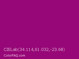 CIELab 34.114,61.032,-23.68 Color is a normal magenta color and the nearest color is Flirt #a2006d. Hex code #970777 and RGB value is rgb(151,7,119). In RGB color space, this color is composed of 59% red, 3% green, 47% blue, In CMYK color space, this color is composed of 0% cyan, 95% magenta, 21% yellow , 41% black , In HSL color space, this color has a hue angle of 313° , 91% saturation and 31% lightness.