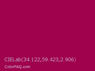 CIELab 34.122,59.423,2.906 Color is a normal rose color and the nearest color is Jazzberry Jam #a50b5e. Hex code #a0024e and RGB value is rgb(160,2,78). In RGB color space, this color is composed of 63% red, 1% green, 31% blue, In CMYK color space, this color is composed of 0% cyan, 99% magenta, 51% yellow , 37% black , In HSL color space, this color has a hue angle of 331° , 98% saturation and 32% lightness.