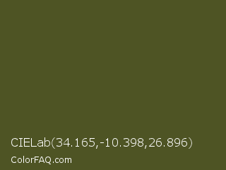 CIELab 34.165,-10.398,26.896 Color is a dark yellow color and the nearest color is Woodland #4d5328. Hex code #4e5424 and RGB value is rgb(78,84,36). In RGB color space, this color is composed of 31% red, 33% green, 14% blue, In CMYK color space, this color is composed of 7% cyan, 0% magenta, 57% yellow , 67% black , In HSL color space, this color has a hue angle of 68° , 40% saturation and 24% lightness.