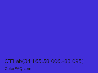 CIELab 34.165,58.006,-83.095 Color is a normal indigo color and the nearest color is Palatinate Blue #273be2. Hex code #412ed9 and RGB value is rgb(65,46,217). In RGB color space, this color is composed of 25% red, 18% green, 85% blue, In CMYK color space, this color is composed of 70% cyan, 79% magenta, 0% yellow , 15% black , In HSL color space, this color has a hue angle of 247° , 69% saturation and 52% lightness.