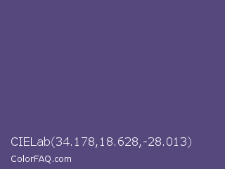 CIELab 34.178,18.628,-28.013 Color is a normal indigo color and the nearest color is Cyber Grape #58427c. Hex code #56487d and RGB value is rgb(86,72,125). In RGB color space, this color is composed of 34% red, 28% green, 49% blue, In CMYK color space, this color is composed of 31% cyan, 42% magenta, 0% yellow , 51% black , In HSL color space, this color has a hue angle of 256° , 27% saturation and 39% lightness.