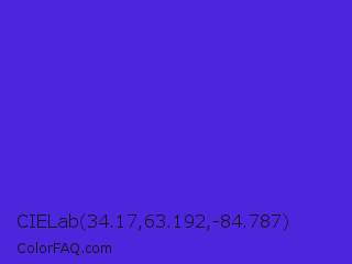 CIELab 34.17,63.192,-84.787 Color is a normal indigo color and the nearest color is Han Purple #5218fa. Hex code #4c26dc and RGB value is rgb(76,38,220). In RGB color space, this color is composed of 30% red, 15% green, 86% blue, In CMYK color space, this color is composed of 65% cyan, 83% magenta, 0% yellow , 14% black , In HSL color space, this color has a hue angle of 253° , 72% saturation and 51% lightness.