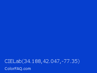 CIELab 34.188,42.047,-77.35 Color is a normal blue color and the nearest color is Absolute Zero #0048ba. Hex code #063fcf and RGB value is rgb(6,63,207). In RGB color space, this color is composed of 2% red, 25% green, 81% blue, In CMYK color space, this color is composed of 97% cyan, 70% magenta, 0% yellow , 19% black , In HSL color space, this color has a hue angle of 223° , 94% saturation and 42% lightness.
