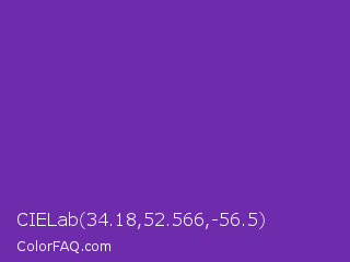 CIELab 34.18,52.566,-56.5 Color is a normal purple color and the nearest color is Grape #6f2da8. Hex code #6e2cac and RGB value is rgb(110,44,172). In RGB color space, this color is composed of 43% red, 17% green, 67% blue, In CMYK color space, this color is composed of 36% cyan, 74% magenta, 0% yellow , 33% black , In HSL color space, this color has a hue angle of 271° , 59% saturation and 42% lightness.