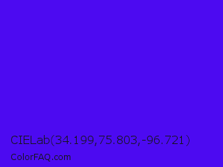 CIELab 34.199,75.803,-96.721 Color is a normal indigo color and the nearest color is Han Purple #5218fa. Hex code #4c0af1 and RGB value is rgb(76,10,241). In RGB color space, this color is composed of 30% red, 4% green, 95% blue, In CMYK color space, this color is composed of 68% cyan, 96% magenta, 0% yellow , 5% black , In HSL color space, this color has a hue angle of 257° , 92% saturation and 49% lightness.