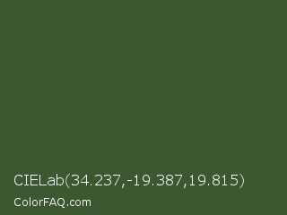 CIELab 34.237,-19.387,19.815 Color is a dark green color and the nearest color is Tom Thumb #3f583b. Hex code #3b5830 and RGB value is rgb(59,88,48). In RGB color space, this color is composed of 23% red, 35% green, 19% blue, In CMYK color space, this color is composed of 33% cyan, 0% magenta, 45% yellow , 65% black , In HSL color space, this color has a hue angle of 104° , 29% saturation and 27% lightness.