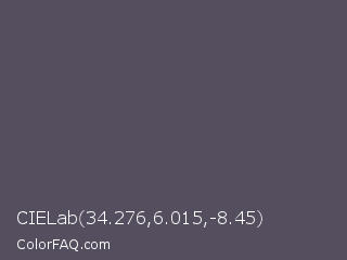 CIELab 34.276,6.015,-8.45 Color is a normal violet color and the nearest color is Scarpa Flow #585562. Hex code #544e5e and RGB value is rgb(84,78,94). In RGB color space, this color is composed of 33% red, 31% green, 37% blue, In CMYK color space, this color is composed of 11% cyan, 17% magenta, 0% yellow , 63% black , In HSL color space, this color has a hue angle of 263° , 9% saturation and 34% lightness.
