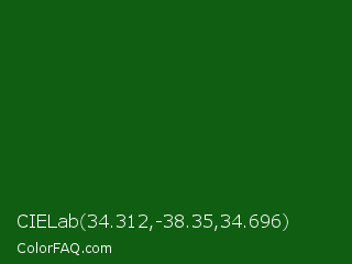 CIELab 34.312,-38.35,34.696 Color is a very dark green color and the nearest color is San Felix #0b6207. Hex code #105e12 and RGB value is rgb(16,94,18). In RGB color space, this color is composed of 6% red, 37% green, 7% blue, In CMYK color space, this color is composed of 83% cyan, 0% magenta, 81% yellow , 63% black , In HSL color space, this color has a hue angle of 122° , 71% saturation and 22% lightness.
