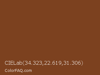 CIELab 34.323,22.619,31.306 Color is a dark orange color and the nearest color is Walnut #773f1a. Hex code #7c411f and RGB value is rgb(124,65,31). In RGB color space, this color is composed of 49% red, 25% green, 12% blue, In CMYK color space, this color is composed of 0% cyan, 48% magenta, 75% yellow , 51% black , In HSL color space, this color has a hue angle of 22° , 60% saturation and 30% lightness.