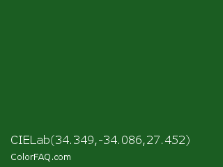 CIELab 34.349,-34.086,27.452 Color is a dark green color and the nearest color is Parsley #134f19. Hex code #1b5d22 and RGB value is rgb(27,93,34). In RGB color space, this color is composed of 11% red, 36% green, 13% blue, In CMYK color space, this color is composed of 71% cyan, 0% magenta, 63% yellow , 64% black , In HSL color space, this color has a hue angle of 126° , 55% saturation and 24% lightness.