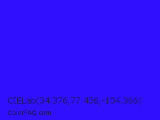 CIELab 34.376,77.456,-104.366 Color is a normal indigo color and the nearest color is Electric Ultramarine #3f00ff. Hex code #300fff and RGB value is rgb(48,15,255). In RGB color space, this color is composed of 19% red, 6% green, 100% blue, In CMYK color space, this color is composed of 81% cyan, 94% magenta, 0% yellow , 0% black , In HSL color space, this color has a hue angle of 248° , 100% saturation and 53% lightness.