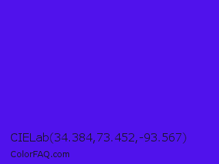 CIELab 34.384,73.452,-93.567 Color is a normal indigo color and the nearest color is Han Purple #5218fa. Hex code #5012ec and RGB value is rgb(80,18,236). In RGB color space, this color is composed of 31% red, 7% green, 93% blue, In CMYK color space, this color is composed of 66% cyan, 92% magenta, 0% yellow , 7% black , In HSL color space, this color has a hue angle of 257° , 86% saturation and 50% lightness.