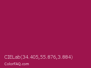 CIELab 34.405,55.876,3.884 Color is a normal rose color and the nearest color is French Wine #ac1e44. Hex code #9d144d and RGB value is rgb(157,20,77). In RGB color space, this color is composed of 62% red, 8% green, 30% blue, In CMYK color space, this color is composed of 0% cyan, 87% magenta, 51% yellow , 38% black , In HSL color space, this color has a hue angle of 335° , 77% saturation and 35% lightness.