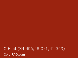 CIELab 34.406,48.071,41.349 Color is a normal red color and the nearest color is Tabasco #a02712. Hex code #9b230f and RGB value is rgb(155,35,15). In RGB color space, this color is composed of 61% red, 14% green, 6% blue, In CMYK color space, this color is composed of 0% cyan, 77% magenta, 90% yellow , 39% black , In HSL color space, this color has a hue angle of 9° , 82% saturation and 33% lightness.