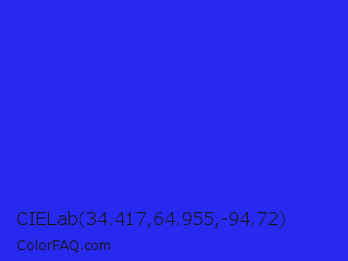 CIELab 34.417,64.955,-94.72 Color is a normal blue color and the nearest color is Bluebonnet #1c1cf0. Hex code #2829ee and RGB value is rgb(40,41,238). In RGB color space, this color is composed of 16% red, 16% green, 93% blue, In CMYK color space, this color is composed of 83% cyan, 83% magenta, 0% yellow , 7% black , In HSL color space, this color has a hue angle of 240° , 85% saturation and 55% lightness.
