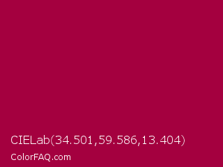CIELab 34.501,59.586,13.404 Color is a normal rose color and the nearest color is Pink Raspberry #980036. Hex code #a4003f and RGB value is rgb(164,0,63). In RGB color space, this color is composed of 64% red, 0% green, 25% blue, In CMYK color space, this color is composed of 0% cyan, 100% magenta, 62% yellow , 36% black , In HSL color space, this color has a hue angle of 337° , 100% saturation and 32% lightness.