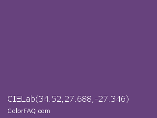 CIELab 34.52,27.688,-27.346 Color is a normal purple color and the nearest color is Cyber Grape #58427c. Hex code #67427d and RGB value is rgb(103,66,125). In RGB color space, this color is composed of 40% red, 26% green, 49% blue, In CMYK color space, this color is composed of 18% cyan, 47% magenta, 0% yellow , 51% black , In HSL color space, this color has a hue angle of 278° , 31% saturation and 37% lightness.