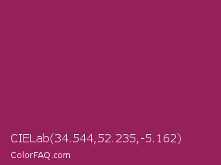 CIELab 34.544,52.235,-5.162 Color is a normal rose color and the nearest color is Dark Raspberry #872657. Hex code #96205b and RGB value is rgb(150,32,91). In RGB color space, this color is composed of 59% red, 13% green, 36% blue, In CMYK color space, this color is composed of 0% cyan, 79% magenta, 39% yellow , 41% black , In HSL color space, this color has a hue angle of 330° , 65% saturation and 36% lightness.