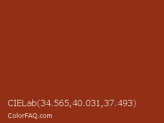 CIELab 34.565,40.031,37.493 Color is a normal red color and the nearest color is Kobe #882d17. Hex code #923016 and RGB value is rgb(146,48,22). In RGB color space, this color is composed of 57% red, 19% green, 9% blue, In CMYK color space, this color is composed of 0% cyan, 67% magenta, 85% yellow , 43% black , In HSL color space, this color has a hue angle of 13° , 74% saturation and 33% lightness.