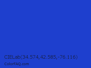 CIELab 34.574,42.585,-76.116 Color is a normal blue color and the nearest color is New Car #214fc6. Hex code #1e3fce and RGB value is rgb(30,63,206). In RGB color space, this color is composed of 12% red, 25% green, 81% blue, In CMYK color space, this color is composed of 85% cyan, 69% magenta, 0% yellow , 19% black , In HSL color space, this color has a hue angle of 229° , 75% saturation and 46% lightness.