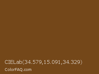 CIELab 34.579,15.091,34.329 Color is a dark orange color and the nearest color is Raw Umber #734a12. Hex code #744719 and RGB value is rgb(116,71,25). In RGB color space, this color is composed of 45% red, 28% green, 10% blue, In CMYK color space, this color is composed of 0% cyan, 39% magenta, 78% yellow , 55% black , In HSL color space, this color has a hue angle of 30° , 65% saturation and 28% lightness.