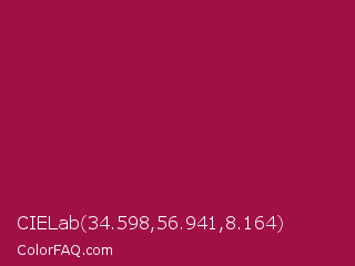 CIELab 34.598,56.941,8.164 Color is a normal rose color and the nearest color is French Wine #ac1e44. Hex code #a01047 and RGB value is rgb(160,16,71). In RGB color space, this color is composed of 63% red, 6% green, 28% blue, In CMYK color space, this color is composed of 0% cyan, 90% magenta, 56% yellow , 37% black , In HSL color space, this color has a hue angle of 337° , 82% saturation and 35% lightness.