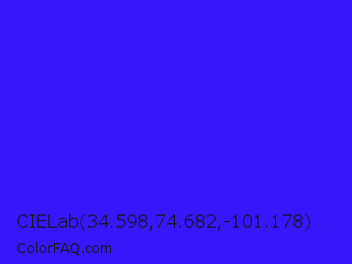 CIELab 34.598,74.682,-101.178 Color is a normal indigo color and the nearest color is Electric Ultramarine #3f00ff. Hex code #3617fa and RGB value is rgb(54,23,250). In RGB color space, this color is composed of 21% red, 9% green, 98% blue, In CMYK color space, this color is composed of 78% cyan, 91% magenta, 0% yellow , 2% black , In HSL color space, this color has a hue angle of 248° , 96% saturation and 54% lightness.