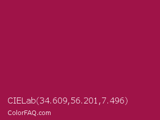 CIELab 34.609,56.201,7.496 Color is a normal rose color and the nearest color is French Wine #ac1e44. Hex code #9f1348 and RGB value is rgb(159,19,72). In RGB color space, this color is composed of 62% red, 7% green, 28% blue, In CMYK color space, this color is composed of 0% cyan, 88% magenta, 55% yellow , 38% black , In HSL color space, this color has a hue angle of 337° , 79% saturation and 35% lightness.