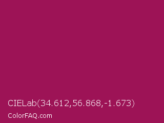 CIELab 34.612,56.868,-1.673 Color is a normal rose color and the nearest color is Jazzberry Jam #a50b5e. Hex code #9d1356 and RGB value is rgb(157,19,86). In RGB color space, this color is composed of 62% red, 7% green, 34% blue, In CMYK color space, this color is composed of 0% cyan, 88% magenta, 45% yellow , 38% black , In HSL color space, this color has a hue angle of 331° , 78% saturation and 35% lightness.