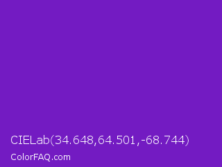 CIELab 34.648,64.501,-68.744 Color is a normal purple color and the nearest color is Purple Heart Crayola #652dc1. Hex code #731bc2 and RGB value is rgb(115,27,194). In RGB color space, this color is composed of 45% red, 11% green, 76% blue, In CMYK color space, this color is composed of 41% cyan, 86% magenta, 0% yellow , 24% black , In HSL color space, this color has a hue angle of 272° , 76% saturation and 43% lightness.