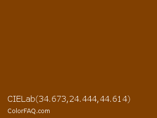 CIELab 34.673,24.444,44.614 Color is a dark orange color and the nearest color is Cinnamon #7b3f00. Hex code #814001 and RGB value is rgb(129,64,1). In RGB color space, this color is composed of 51% red, 25% green, 0% blue, In CMYK color space, this color is composed of 0% cyan, 50% magenta, 99% yellow , 49% black , In HSL color space, this color has a hue angle of 30° , 98% saturation and 25% lightness.
