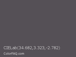 CIELab 34.682,3.323,-2.782 Color is a normal purple color and the nearest color is Davys Grey #555555. Hex code #555056 and RGB value is rgb(85,80,86). In RGB color space, this color is composed of 33% red, 31% green, 34% blue, In CMYK color space, this color is composed of 1% cyan, 7% magenta, 0% yellow , 66% black , In HSL color space, this color has a hue angle of 290° , 4% saturation and 33% lightness.