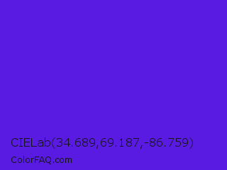 CIELab 34.689,69.187,-86.759 Color is a normal indigo color and the nearest color is Han Purple #5218fa. Hex code #591be1 and RGB value is rgb(89,27,225). In RGB color space, this color is composed of 35% red, 11% green, 88% blue, In CMYK color space, this color is composed of 60% cyan, 88% magenta, 0% yellow , 12% black , In HSL color space, this color has a hue angle of 259° , 79% saturation and 49% lightness.