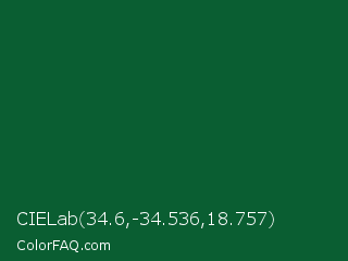 CIELab 34.6,-34.536,18.757 Color is a very dark green color and the nearest color is Sacramento State Green #00563f. Hex code #0a5e32 and RGB value is rgb(10,94,50). In RGB color space, this color is composed of 4% red, 37% green, 20% blue, In CMYK color space, this color is composed of 89% cyan, 0% magenta, 47% yellow , 63% black , In HSL color space, this color has a hue angle of 149° , 81% saturation and 20% lightness.