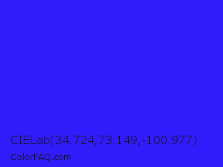 CIELab 34.724,73.149,-100.977 Color is a normal indigo color and the nearest color is Bluebonnet #1c1cf0. Hex code #301cfa and RGB value is rgb(48,28,250). In RGB color space, this color is composed of 19% red, 11% green, 98% blue, In CMYK color space, this color is composed of 81% cyan, 89% magenta, 0% yellow , 2% black , In HSL color space, this color has a hue angle of 245° , 96% saturation and 55% lightness.